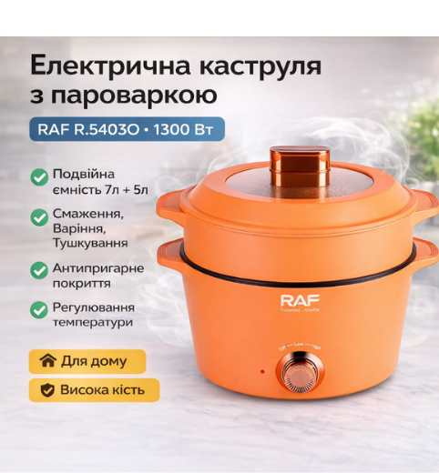Електрична каструля — це універсальний кухонний помічник, який поєднує функції каструлі та пароварки. Завдяки високій потужності 1300 Вт пристрій швидко нагрівається та дозволяє готувати різноманітні страви: від смажених до дієтичних на парі.